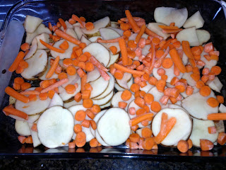 Step 1: Wash and slice potatoes. If you want higher standards, you could actually peel the potatoes. Jonah was being lazy. And it's totally fine, because the skin is good for you right? If you want to have this cook quicker, remember to slice everything thin. As far as amounts of each of these ingredients, it is totally up to you! Some like lots of potatoes, and other veggies, some don't.