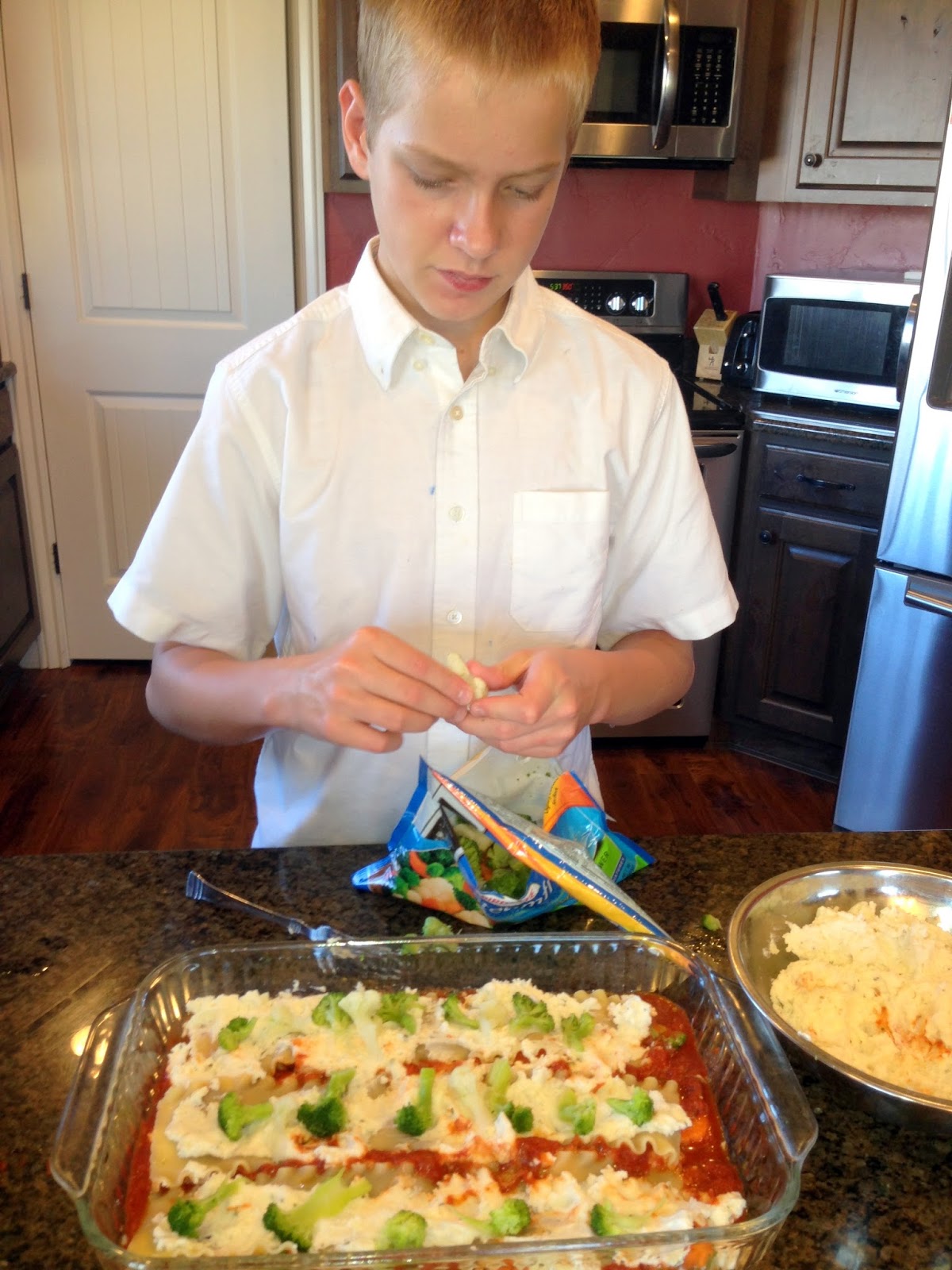 Take your veggies out. Break up your broccoli pieces to be a bit smaller and spread them sparingly on top.